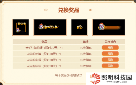 通過戳戳樂獲得的彈珠兌換金蛇狂舞稱謂(限時30天)、花花蛇銘牌(限時30天)、花花蛇彩框(限時30天)、花花蛇隊標(限時30天),每種道具僅可兌換1次。