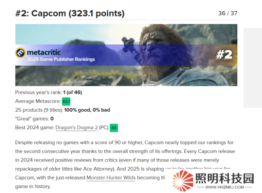 2)卡普空(323.1分) – 82.1 (去年:第1名)?最佳游戲:《龍之信條2》?88分