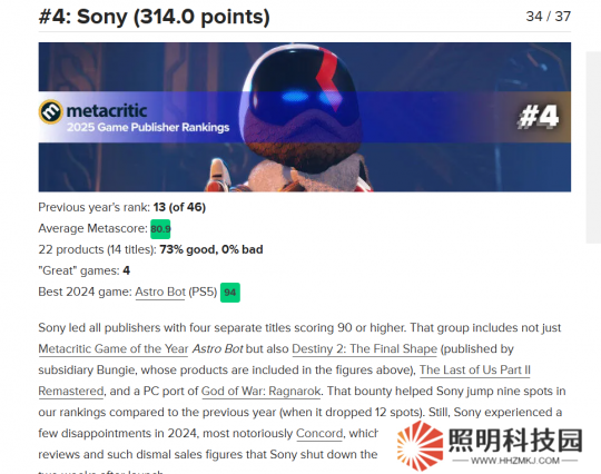 4)索尼?(314分) – 80.9 (去年:第13名)?最佳游戲:《宇宙機(jī)器人》?94分