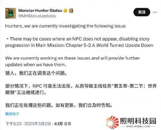 卡普空在公告中表示:“獵人們,我們正在調查以下問題。部分情況下,NPC 未出現,導致主線任務第五章第二節的劇情無法推進。我們正在解決這一問題,并會在有新進展時向大家更新。”