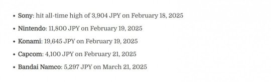 在其“Kantan Games”博客中,這名分析師解釋說索尼的股價在今年2月18日來到歷史新高,達到3904日元。此外,還有任天堂(11800日元)、科樂美(19645日元)、卡普空(4100日元)和萬代南夢宮(5297日元)。