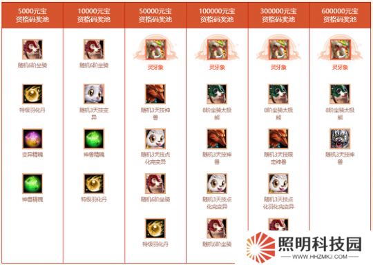 普通版玩家有機會贏得八階坐騎靈牙象、隨**階或九階坐騎(僅至尊系列)、隨機元靈、點化羽化滿的神獸、隨機變異等獎勵。