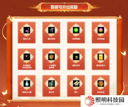 喜袋內含豐富獎勵,普通版的道友有機會開出隨機元靈(元靈從赤天、混沌、笛舞、降魔、夫諸、震魃中隨機開出)、隨機神獸、變異、神獸精魄、變異精魄、滿屬性裝備箱、80級隨機所有相首飾、道具套餐卡、商城道具、道行,游戲幣等。