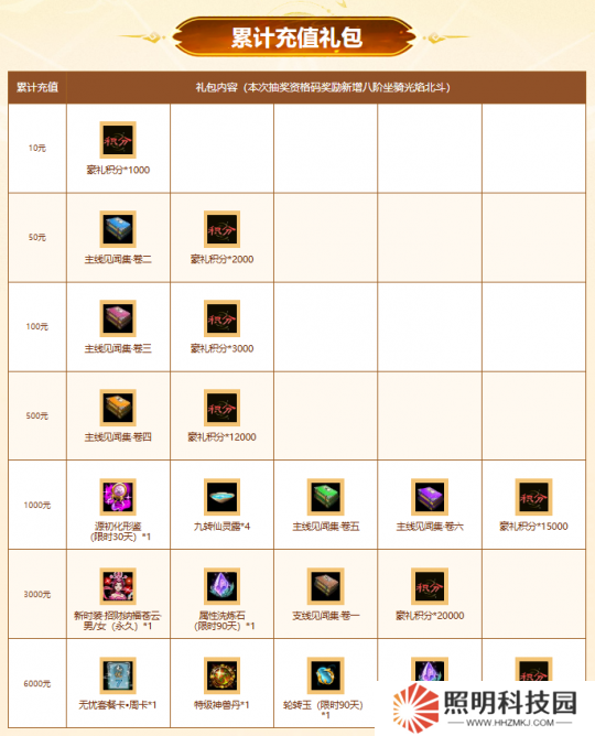 在新服“道十九”累計充值每達到10元、50元、100元、500元、1000元、3000元、6000元階段可以獲得相應(yīng)的累計充值禮包,其中包含了豐厚的游戲道具獎勵和豪禮積分獎勵!