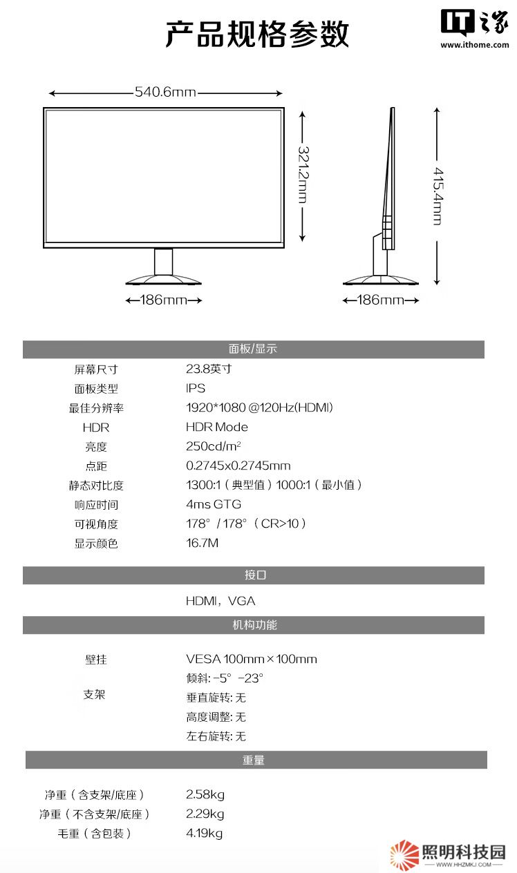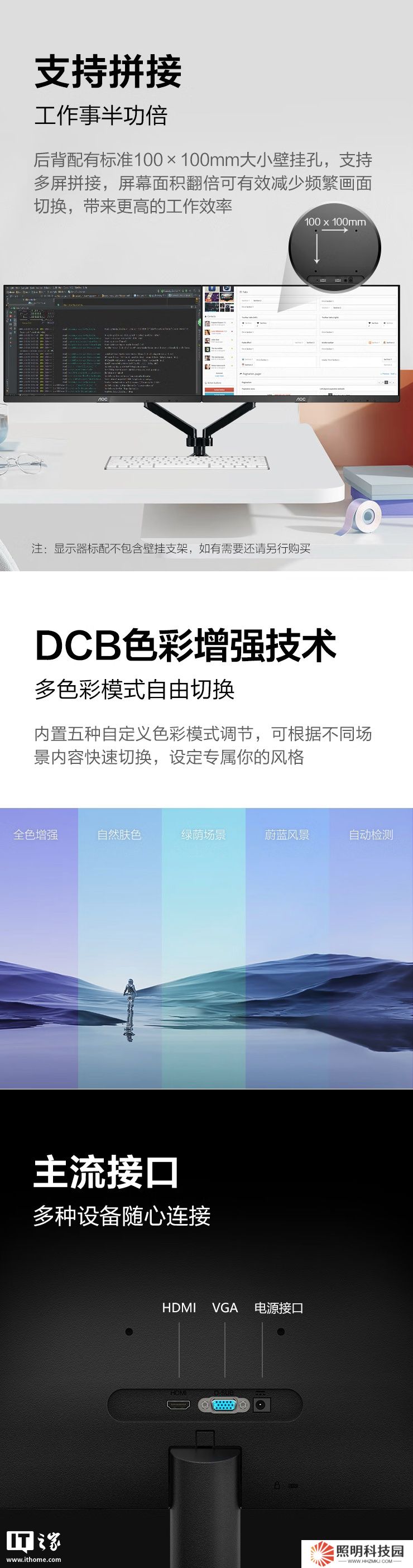 該顯示器支架支持傾斜,支持 VESA 100x100mm壁掛,提供HDMI和 VGA接口。