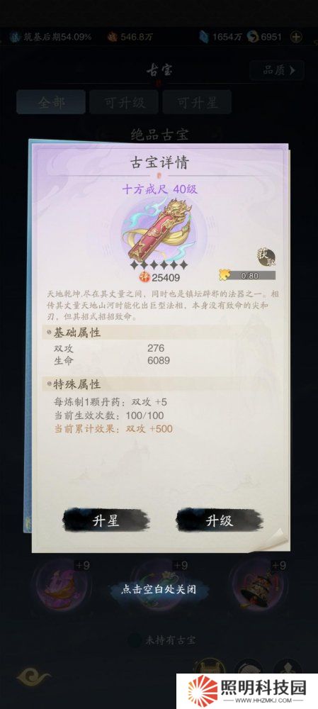 然后就是古寶,古寶可以提升玩家的基礎屬性和特殊屬性,基礎屬性的話自不必說,特殊屬性是挺有意思的一個設定,比如十方戒尺的特殊屬性是每煉制一顆丹藥可以獲得雙攻+5的屬性提升,所以獲得這樣的古寶越早越好,然后通過煉藥的同時,提高屬性。
