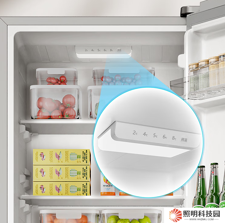冰箱運行狀態下噪音低至 37 分貝,低于國家標準中對于電冰箱噪音的限值。新品支持電子式精準調溫,2℃/4℃/5℃/6℃/8℃五檔靈活調控制冷。