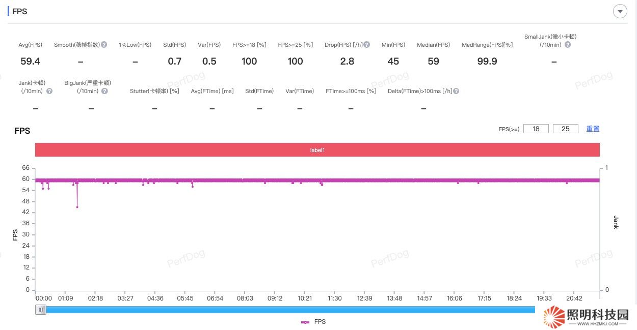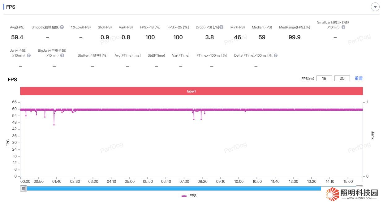 測試過程中,小編主要是在游戲中的楓丹廷進行跑圖,20 分鐘后測得平均幀率為 59.4 fps,可以幀率幾乎沒有波動,非常平穩。