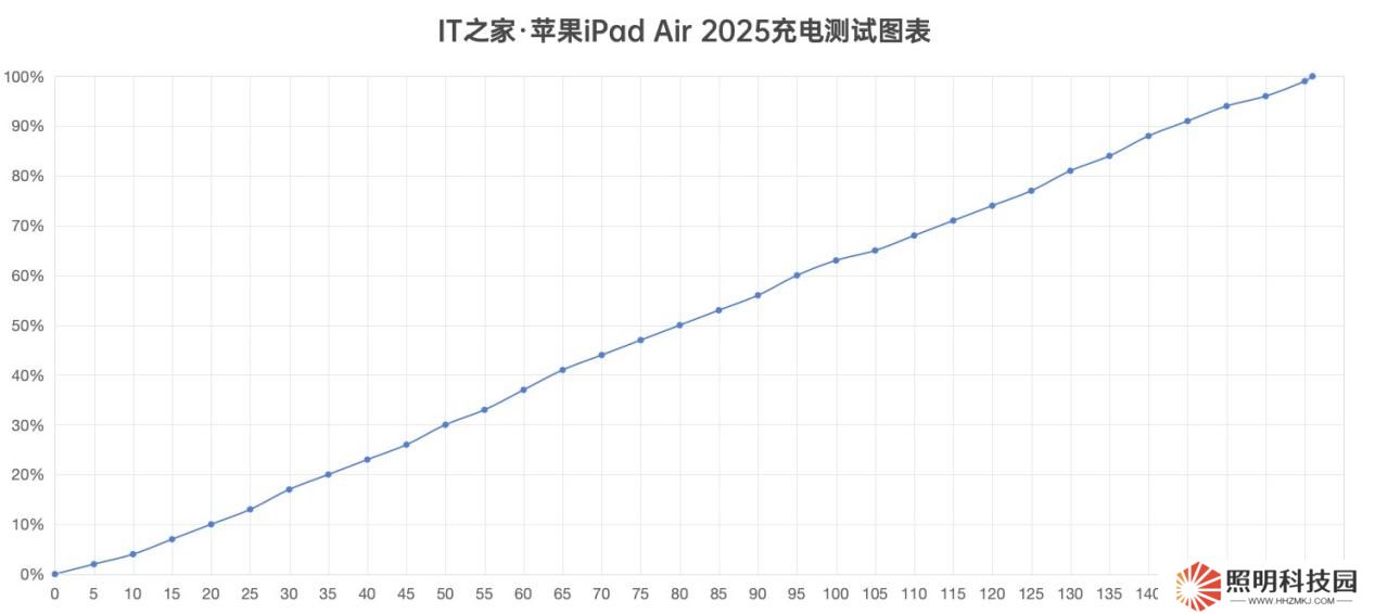 充電方面,本站使用標配的 20W 充電頭,將 iPad Air 2025 從電量 0% 充滿到 100%,共用時 161 分鐘,時間是比較長的。