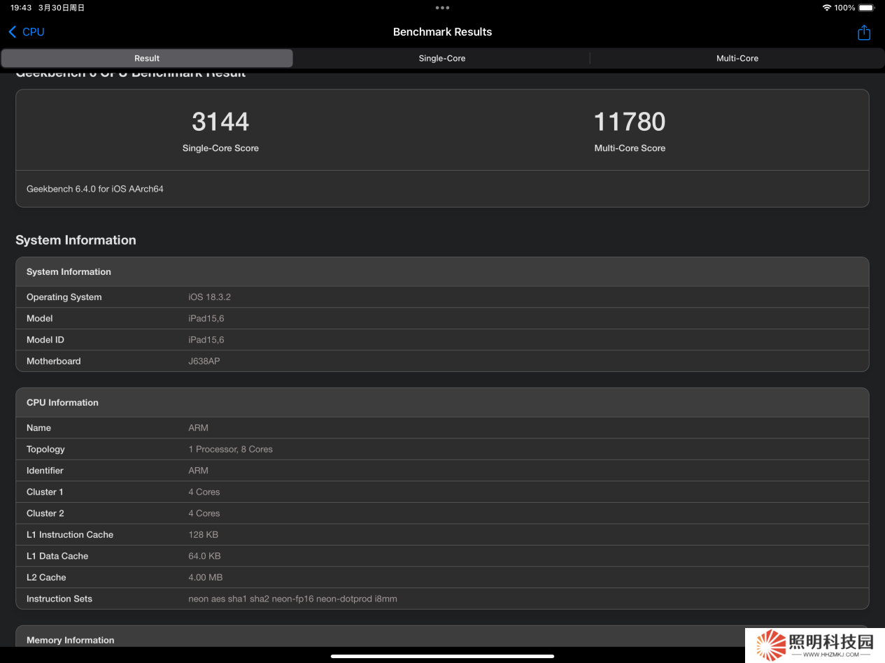 然后是《GeekBench 6》的跑分,iPad Air 2025 單核 3144 分,多核成績 11780 分,性能表現同樣十分強悍。
