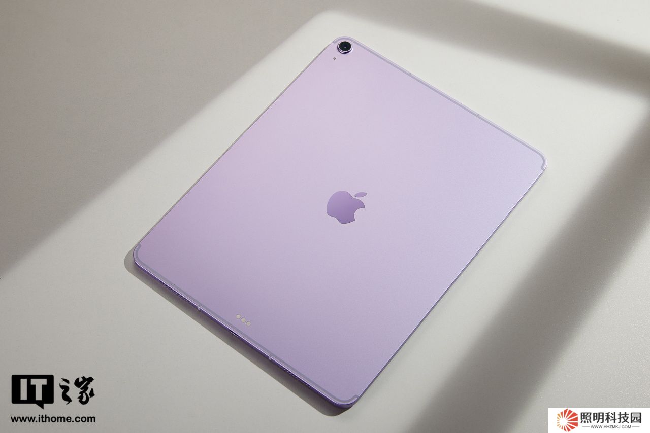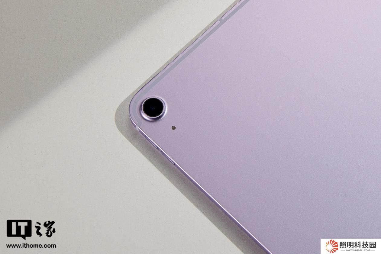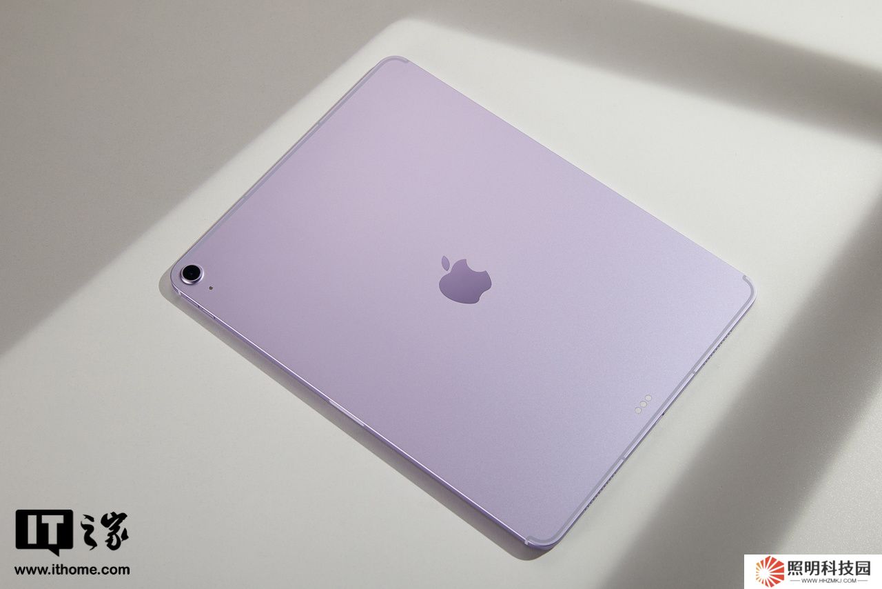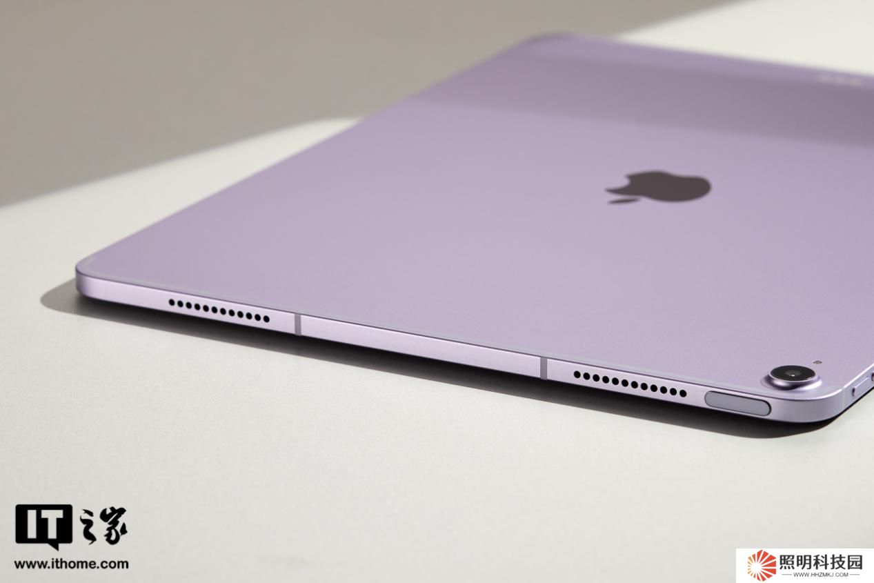 iPad Air 機身采用 100% 再生鋁金屬,紫色版的色澤是比較淡雅的,在光線直射下甚至會有些偏銀灰,有一種神秘夢幻的感覺。