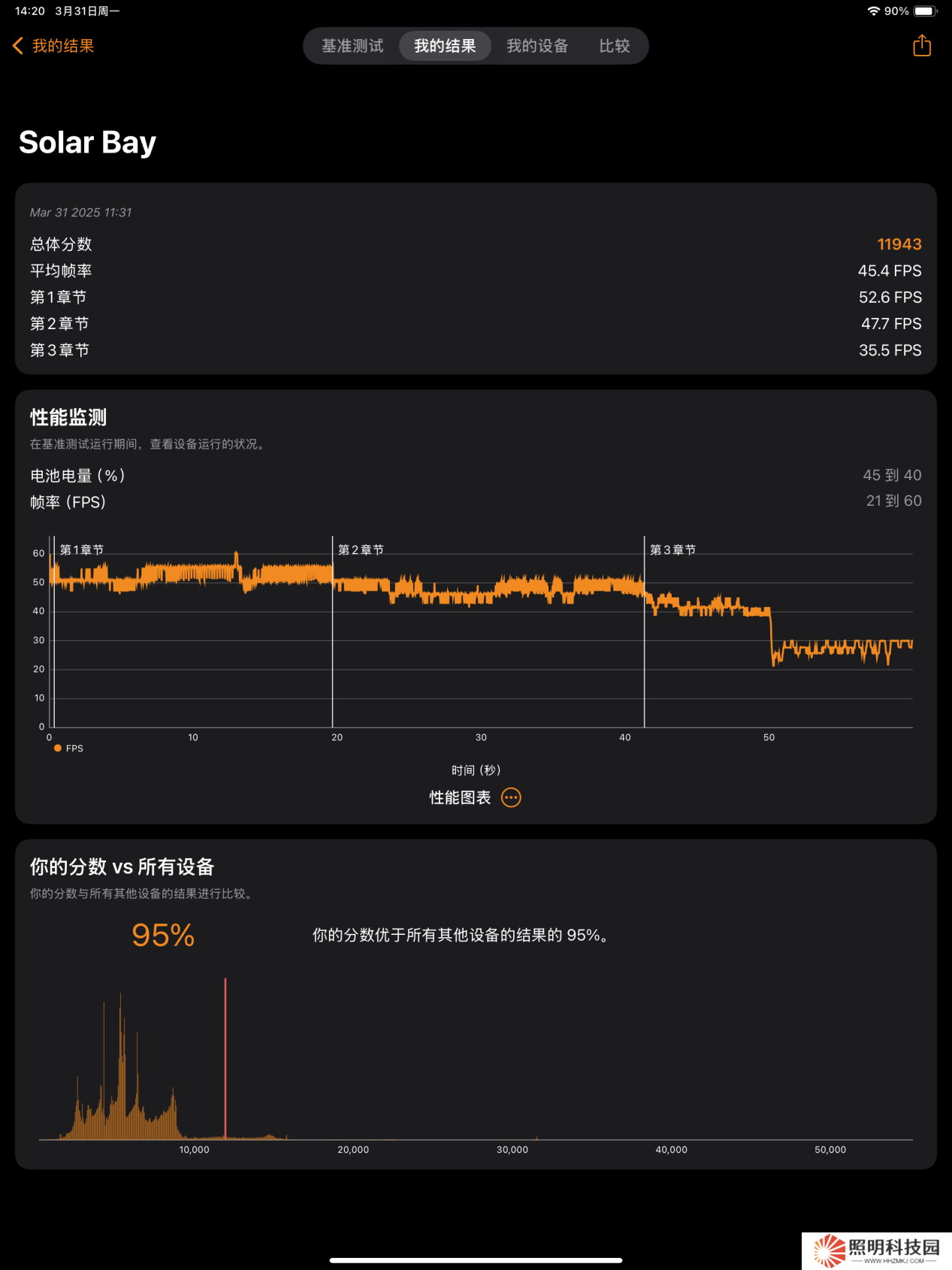 然后是代表光線追蹤性能的 Solar Bay 項目,iPad Air 2025 總體分數為 11943 分,平均幀率達到 45.4 FPS,成績很是出色。