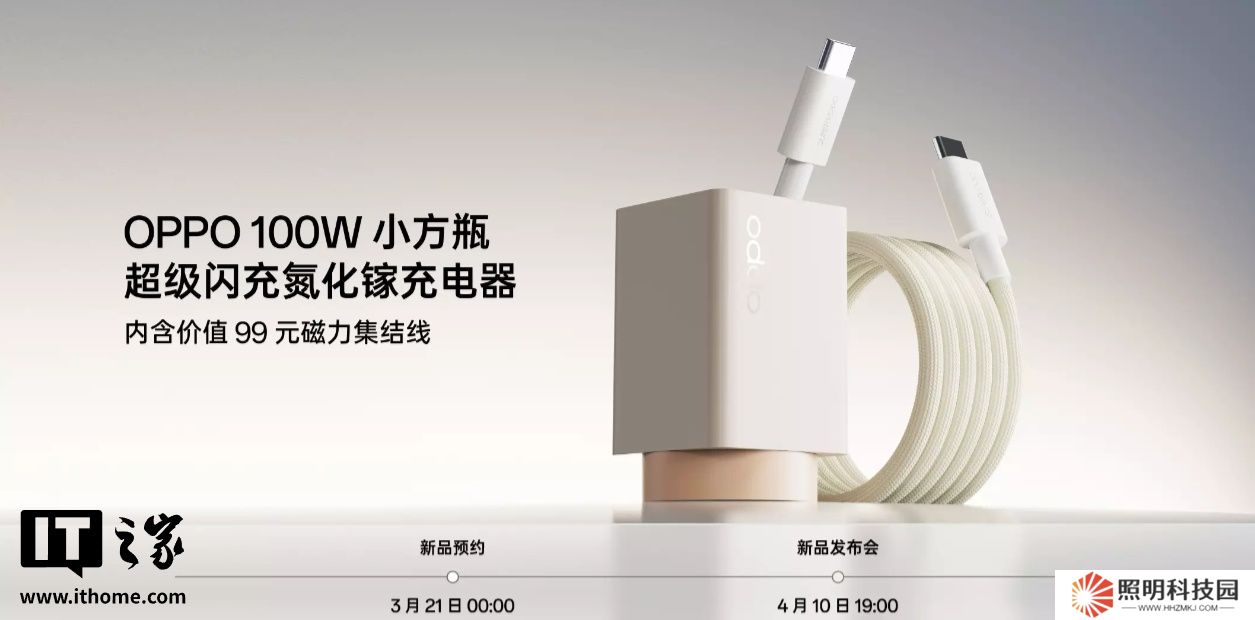 本站 4 月 8 日消息,OPPO 100W 小方瓶超級(jí)閃充氮化鎵充電器今日開啟預(yù)熱,新品采用“前圓后方”的設(shè)計(jì),可配合磁力集結(jié)線使用,4 月 10 日發(fā)布。