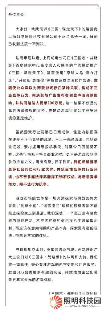 公告中提到:法院審理認定,上海幻電公司在《三國志?戰略版》百度貼吧中以高度嵌入和融合的廣告模式推廣《三國:謀定天下》,并使用“原班人馬 傾力打造”、“升級版 更懂你”等極易造成混淆的廣告語,意圖使公眾誤以為兩款游戲存在某種關聯,構成不正當競爭行為,判決其與廣告發布者刊登聲明消除影響,并共同賠償人民幣100萬元
