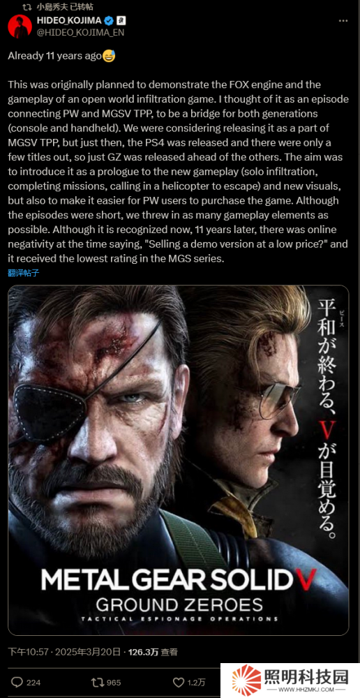 在《合金裝備5:原爆點》發售 11 年后,制作人小島秀夫在社交媒體上回憶了這款游戲發布時獲得大量差評的感受。