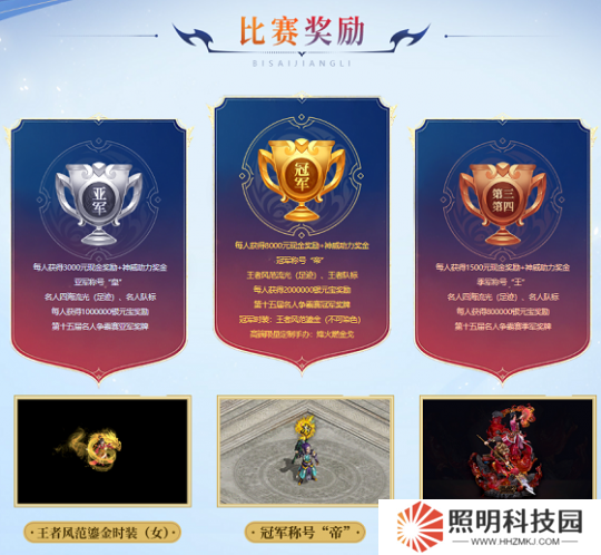 官方為本屆名人爭霸賽豪擲千萬元寶,打造了極為豐厚的獎池。普通賽區冠軍戰隊每人獲得10000元現金獎勵+神威助力獎金,經典賽區冠軍戰隊每人獲得8000元現金獎勵+神威助力獎金,另外兩大賽區冠軍戰隊還將獲得冠軍稱號“帝”、王者風范流光(足跡)、王者隊標、每人獲得2000000銀元寶獎勵、第十五屆名人爭霸賽冠軍獎牌、冠軍時裝:王者風范鎏金(不可染色)、高端限量定制手辦:烽火燃金戈。行走中洲時,盡顯榮耀本色。