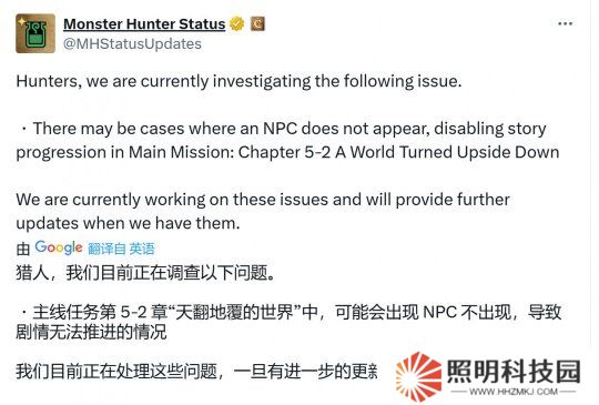 “獵人們,我們目前正在調查以下問題。可能存在NPC不出現的情況,導致主線任務:第5-2章《顛倒的世界》的故事進程受阻。我們目前正在努力解決這些問題,并在有進一步更新時提供。”