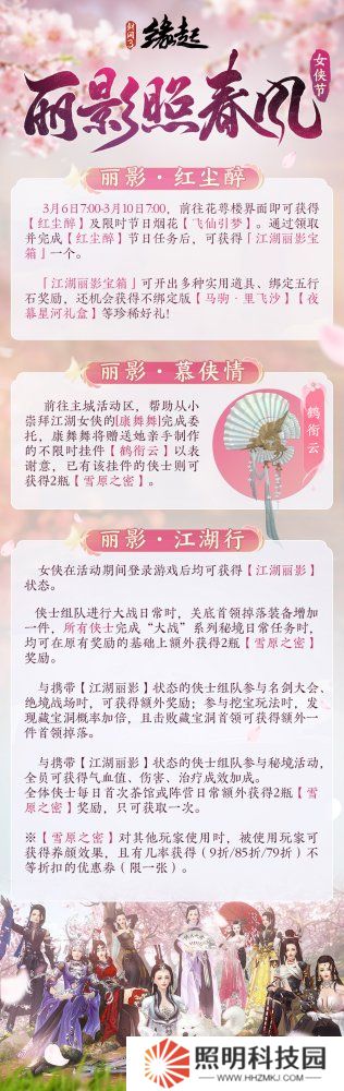 3月6日7:00-3月10日7:00活動期間,前往花萼樓界面可領(lǐng)取「紅塵醉」與限時節(jié)日煙花「飛仙引夢」,完成「紅塵醉」任務(wù)后開啟「江湖麗影寶箱」即有概率獲得不綁定版「馬駒·里飛沙」、「夜幕星河禮盒」等驚喜掉落!完成「康舞舞」的委托必得限定掛件「鶴銜云」,已擁有該掛件的俠士則可獲得「雪原之密」,對其他玩家使用「雪原之密」可為其附加養(yǎng)顏效果,且目標(biāo)俠士有幾率獲得限享一張的(9折/85折/79折)不等折扣優(yōu)惠券!愿各位俠士若皎月凌霜華,似飛鴻踏無蹤,在這片江湖書寫專屬于你的璀璨篇章!