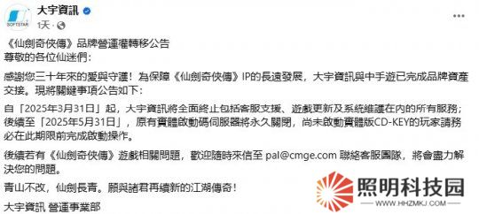 今日,大宇資訊發(fā)布《仙劍奇?zhèn)b傳》品牌營運權轉移公告:自2025年3月31日起,將全面終止對《仙劍奇?zhèn)b傳》系列游戲的客服支持、游戲更新及系統(tǒng)維護等所有服務。此外,游戲實體版激活碼服務器將在2025年5月31日永久關閉。