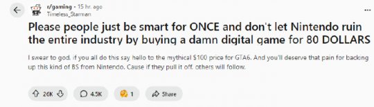 在外網(wǎng)Reddit論壇,最近就有玩家發(fā)起呼吁:“請(qǐng)大家明智一點(diǎn),不要讓任天堂80美元的游戲定價(jià)毀掉整個(gè)行業(yè)!”網(wǎng)友們認(rèn)為,如果這次大家妥協(xié)了,那么未來(lái)就將面臨100美元的《GTA6》。因?yàn)槿翁焯玫某晒Γ瑫?huì)讓同行們效仿。