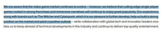 CDPR在財報中寫道:“我們知道電子游戲市場會繼續進化,然而我們相信扎根于強大系列和沉浸式敘事的頂尖單人游戲,將繼續大受歡迎。我們的經驗以及我們的品牌,比如《賽博朋克》《巫師》,這兩個系列我們當然也樂于繼續開發,將會幫助我們建立在市場上的強有力地位,勾勒一副美好的前景。”