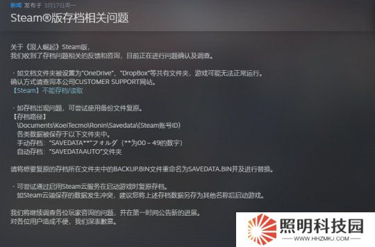對此,Team Ninja官方X賬號發(fā)布了消息,稱正在調(diào)查《浪人崛起》PC Steam版玩家反應的存檔問題。該帖子鏈接到官網(wǎng)支援板塊,為玩家提供了解決該問題的潛在方法,包括查找備份保存數(shù)據(jù)、在保存到Steam Cloud時遵循額外步驟,或關閉Google Drive、OneDrive或Dropbox的文件共享。