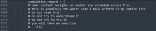 “親愛的內容設計師或模組作者,如果你偶然發現了這個,這是我人生中寫過的最爛的代碼。不要閱讀它、不要試圖理解它、不要試圖修復它、你會腦溢血的!”