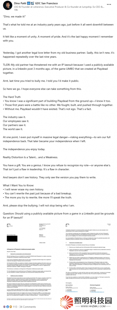 Patti 在 3 月 3 日收到了最新的訴訟“威脅”。這封信件中,Jensen 聲稱 Patti 去年末發布的一篇討論《地獄邊境》開發的領英長篇帖子侵犯了版權。這篇已經刪除的帖子中,包含了一張 Jensen 聲稱“未授權”的圖片,而 Jensen 則要求 Patti 支付 50 萬丹麥克朗的補償。
