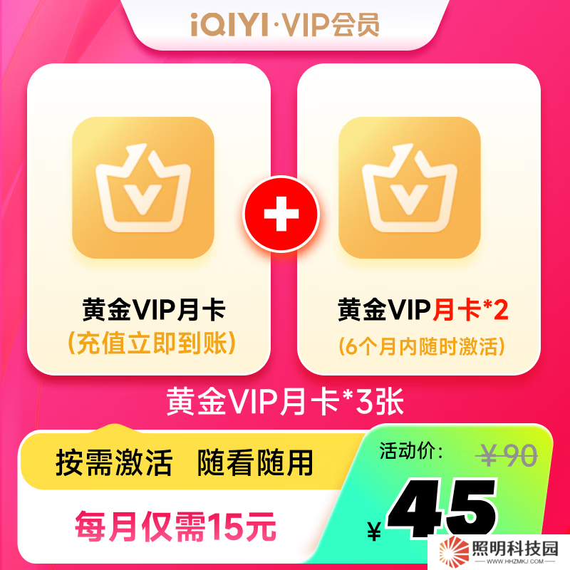 京東愛奇藝囤囤卡 黃金 3 張月卡按需激活 隨看隨用 45 元直達鏈接愛奇藝黃金VIP 會員在同一時間可登錄任意 1 臺設備,支持手機、平板、電腦端使用(不支持 TV 端)。