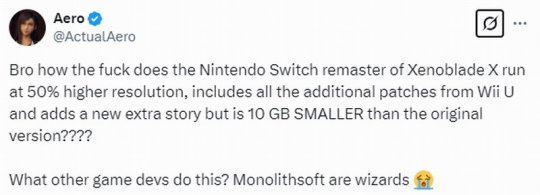 近日玩家Aero發推文稱,《異度神劍X:終極版》容量大小為13.5GB。而WiiU原版容量大小為23GB。為什么終極版分辨率提高了50%,包含了WiiU原版所有附加內容,并增加了一個新的額外劇情,但容量竟比原版小了10個GB。Monolithsoft是法師嗎?其他開發商能做到嗎?
