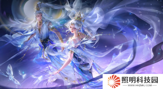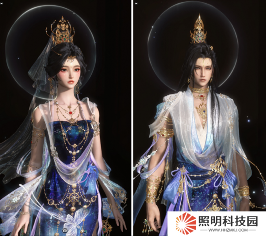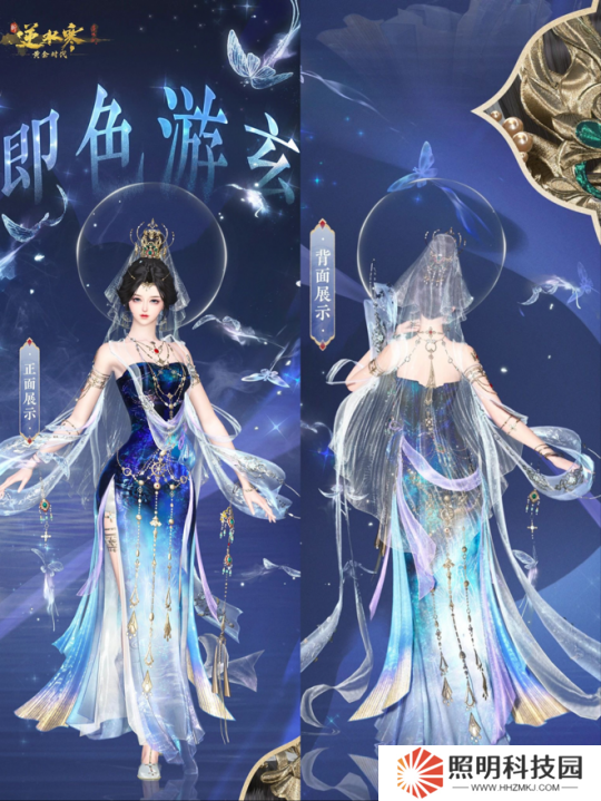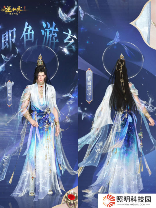 女款【即色游玄】似乎是將九天銀河化作衣裙,從深邃藍色漸變到淺白色的設計頗為別致,背后的皎潔玉盤、隨風搖曳的薄紗,以及華麗精致的飾品組合在一起,將神圣感打滿了全屏,以至于玩家發出了“自此不敢見觀音”的感嘆。