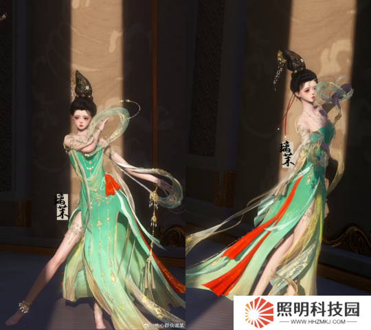 再來看這位玩家,直接在神女時裝的基礎上,爆改了一版極具異域風情的“敦煌風配色”。紅、黃、綠三色的經典混搭、飄逸唯美的紗質設計,結合上展露出的優美線條,這不就是從壁畫中走出來的飛天仙女嘛!