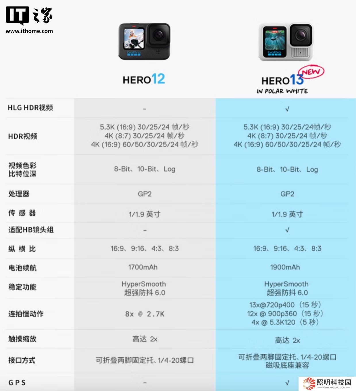 本站附該相機對比 Hero 12 對比參數如下,目前,該相機在京東售價 2998 元,國補 15% 到手價 2548.3 元起: