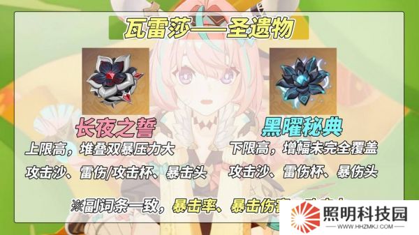 目前納塔兩套契合瓦雷莎的圣遺物都很強,遠超舊圣遺物,建議用新套裝:①黑曜秘典套:下限更高,15%增傷(夜魂加持期間才有)40%暴擊率(需EAAEA啟動消耗夜魂后激活),養成難度極低。可選擇‘攻擊沙、雷傷杯、暴傷頭’;