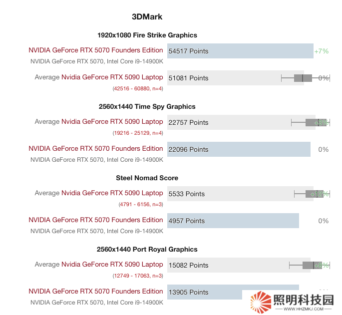 根據(jù)該媒體所述,他們使用 XMG Neo 16 和雷蛇靈刃 16 兩款筆記本作為跑分對象,對比顯卡為英偉達(dá) RTX 5070FE 公版桌面顯卡,在 3Dmark Fire Strike 1080P 跑分中,兩款筆記本平均跑分 51081 分,相較 5070 桌面版的 54517 分低 6.3%;但在 Time Spy 1440P 跑分中,平均跑分為 22757 分,相較 5070 桌面版的 22096 分高 3%。