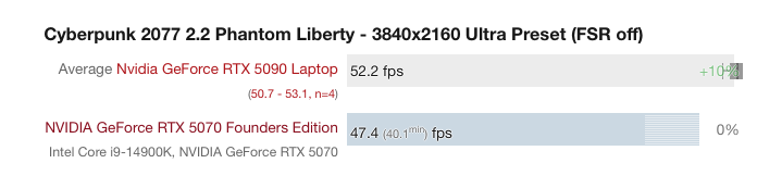 《賽博朋克 2077》:5090 移動版平均為 52.2 幀,5070 桌面版為 47.4 幀,5090 移動版領(lǐng)先 10%