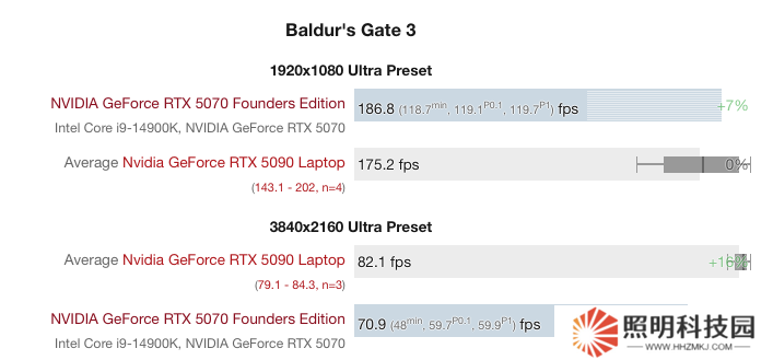 《博德之門 3》:1080P 分辨率下 5090 移動版平均 175.2 幀,5070 桌面版平均為 186.8 幀,5070 桌面版領(lǐng)先 7%,但在 4K 分辨率下,5090 移動版平均 82.1 幀,5070 桌面版為 70.9 幀,5090 移動版領(lǐng)先 16%。