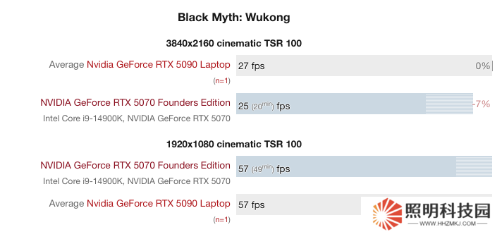 《黑神話:悟空》:在 4K 分辨率下 RTX 5090 移動版平均 27 幀,5070 桌面版平均 25 幀;在 1080P 分辨率下,兩款顯卡均為 57 幀