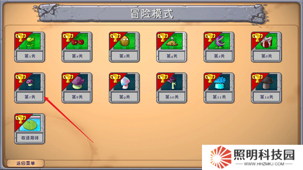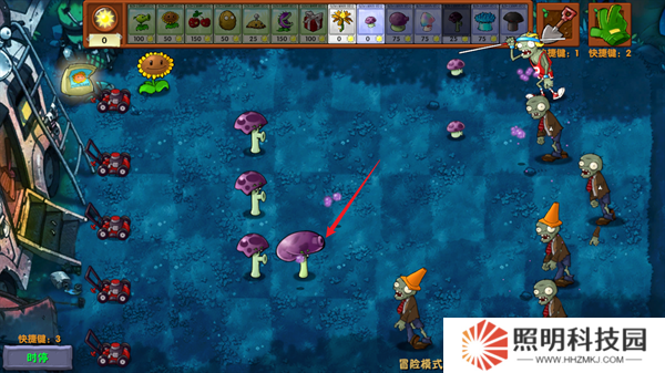 2、在冒險模式當(dāng)中發(fā)點擊第七關(guān),就能夠開始進入到黑夜模式當(dāng)中進行游玩,其中加入了許多蘑菇類型的植物。