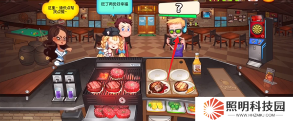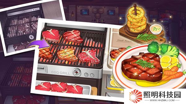 1、玩家們進入關卡之后,將會需要點擊下方的牛排開始進行明火烤制,于此同時布置飲料以及餐盤。