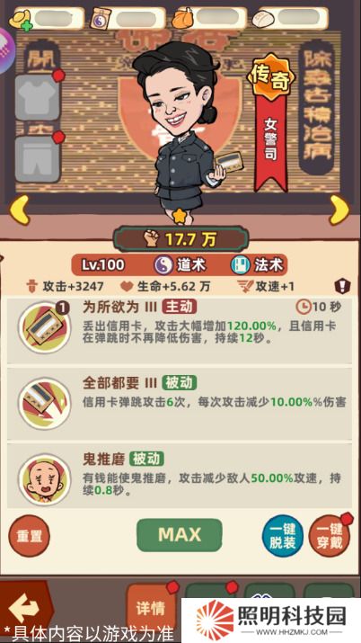 女警司的主動技能是丟出信用卡,被動技能會讓信用卡在敵人之間彈跳,并且能減少敵人50%的攻擊速度。女警司常態下會有較高范圍輸出能力,大俠前期如果缺少范圍輸出傷害,可以選擇女警司培養~