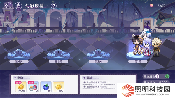 2、在「幻影廢墟」玩法界面下方,可以查看每關挑戰(zhàn)的【上陣限制】等信息,隊伍在符合限制的情況下才能進行戰(zhàn)斗,為了能達到更遠的關卡,嘗試讓自己的隊伍成員變得更豐富多樣吧!