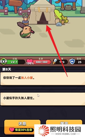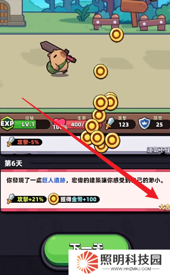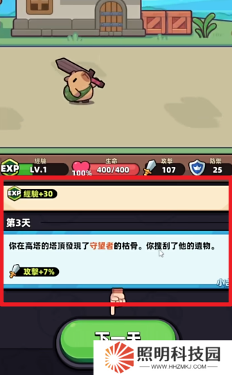 1、玩家們進入游戲之后,將能夠操控自己的小卡皮巴拉開始進行冒險,點擊下一天就能夠進行推進。