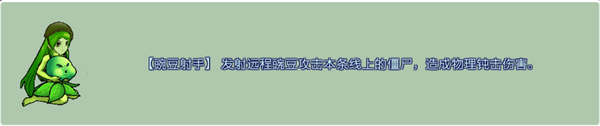 一、【豌豆射手】 發射遠程豌豆攻擊本條線上的僵尸,造成物理鈍擊傷害。