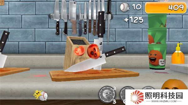5、水果掉落到菜板上后就會被切割,就能夠得到分數加成。