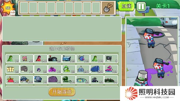 4、進(jìn)入到關(guān)卡內(nèi)后,可以看到右側(cè)是僵尸的類型,選擇植物搭配進(jìn)行出戰(zhàn)。