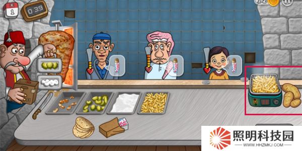 3、點(diǎn)擊餐館桌面托盤中的薯?xiàng)l,這時(shí)它就會(huì)自動(dòng)放進(jìn)卷餅上。