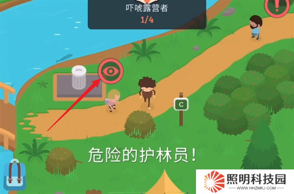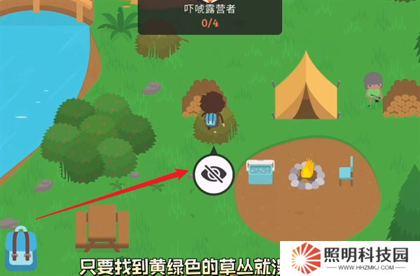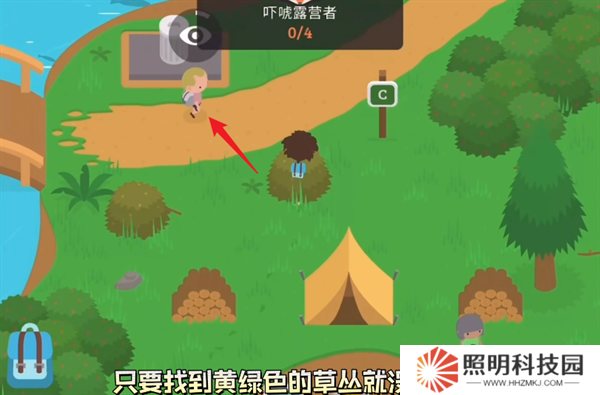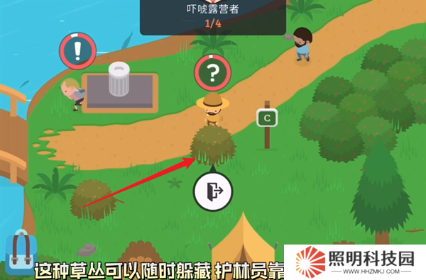 2、然后在營(yíng)地里面找到顏色是黃綠色的草叢,點(diǎn)擊交互按鈕,你就能夠讓大腳怪躲進(jìn)去。