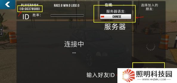 3、進聯機界面后在【語言服務器】的位置選擇CHINESE,然后一直轉圈圈的同學可以點一下右下角【按ID添加好友】的輸入框。