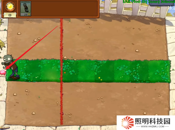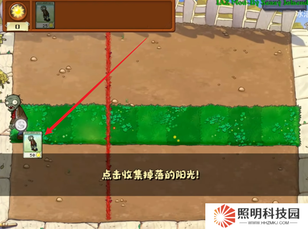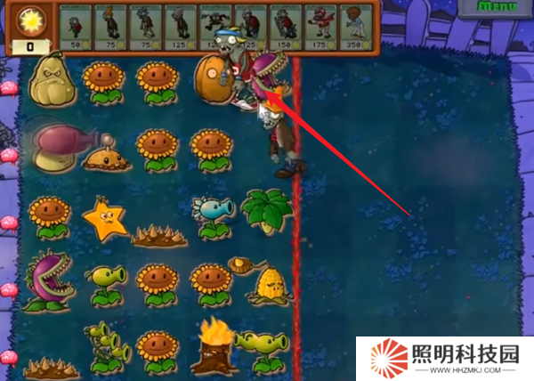 3、等到二路的僵尸破壞向日葵之后,拾取陽光,并在五路放置兩個路障僵尸。